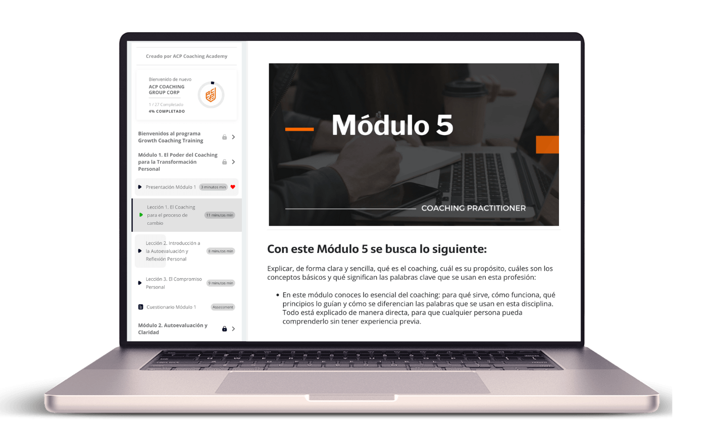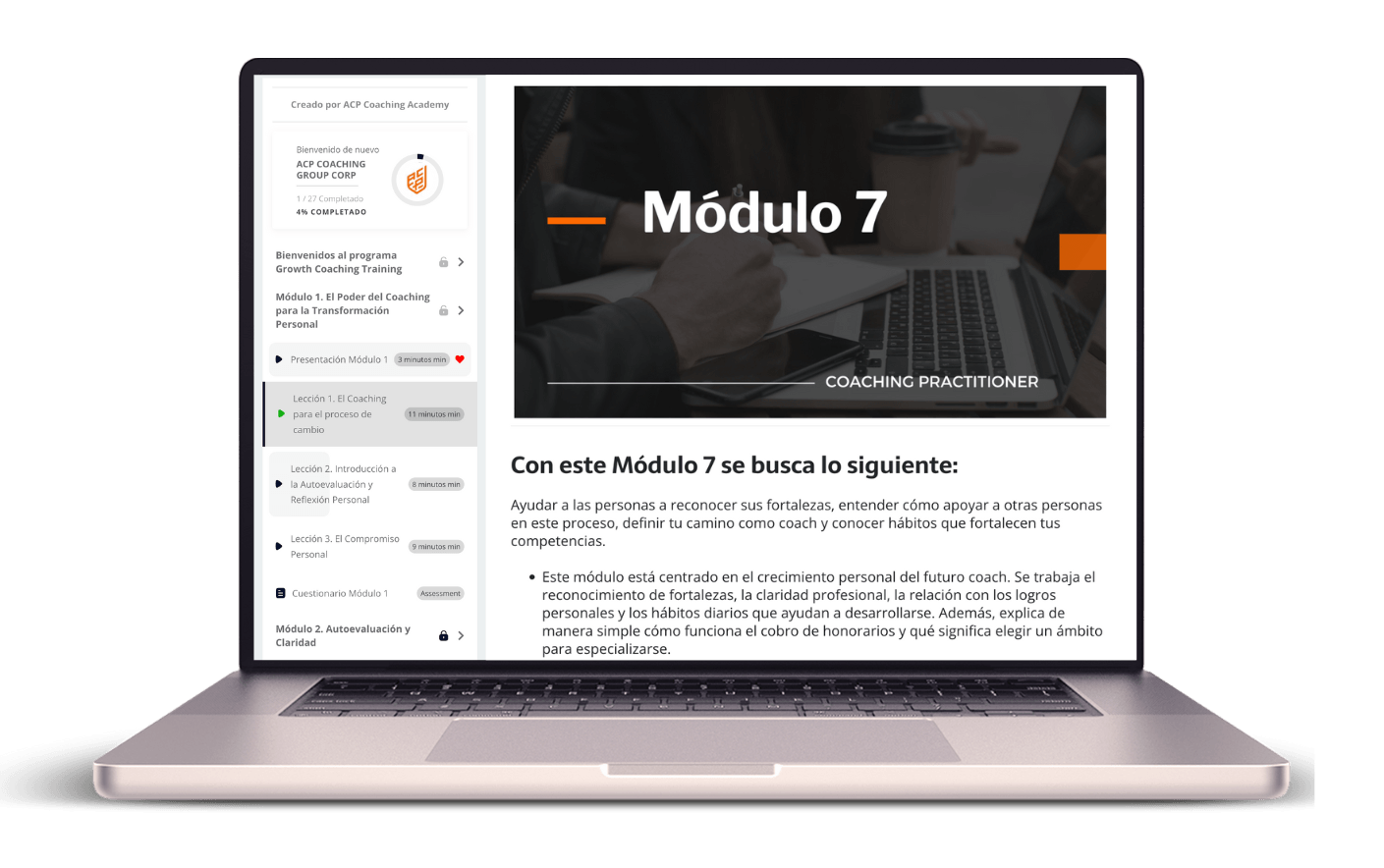 En este tercer módulo, aprenderás cómo el Coaching contribuye en fomentar la motivación interna y a aprovechar las fortalezas personales. Aprenderás cómo se manejan las fugas energéticas y a mantener el enfoque en lo que realmente importa, permitiéndote avanzar sin distracciones.