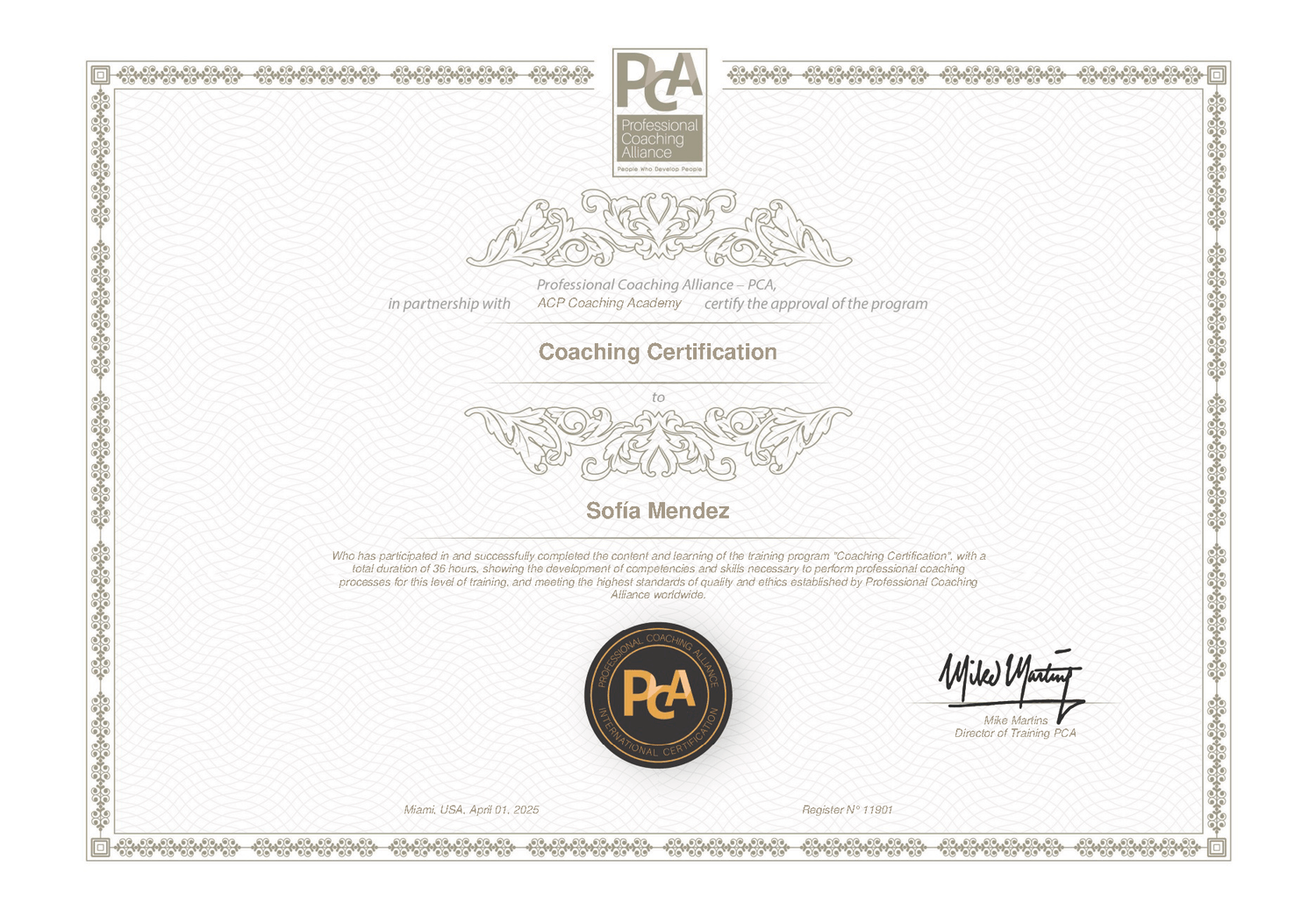 Este certificado es otorgado por haber completado satisfactoriamente el Programa de Certificación de Coaching, donde habrás adquirido las herramientas y técnicas necesarias para su aplicación a nivel personal y profesional.
